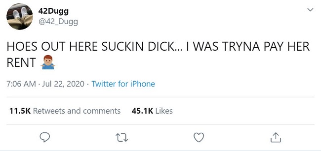 42 Dugg became the top-notch story on 21 July 2020 on Twitter after his new track was leaked. The leaked song has aroused the rumors of the Detroit rapper's sexuality because numerous tweets cited that the lyrics were misheard from the snippets.