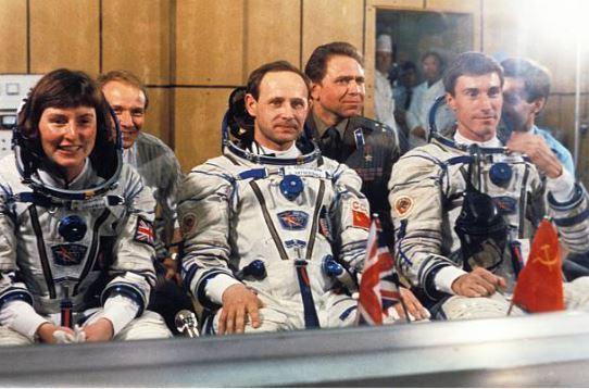 Helen Sharman along with Anatoli Artsebarski and Sergei Krikalev before boarding off to the Soviet Space Station Mir (©: Getty Images)