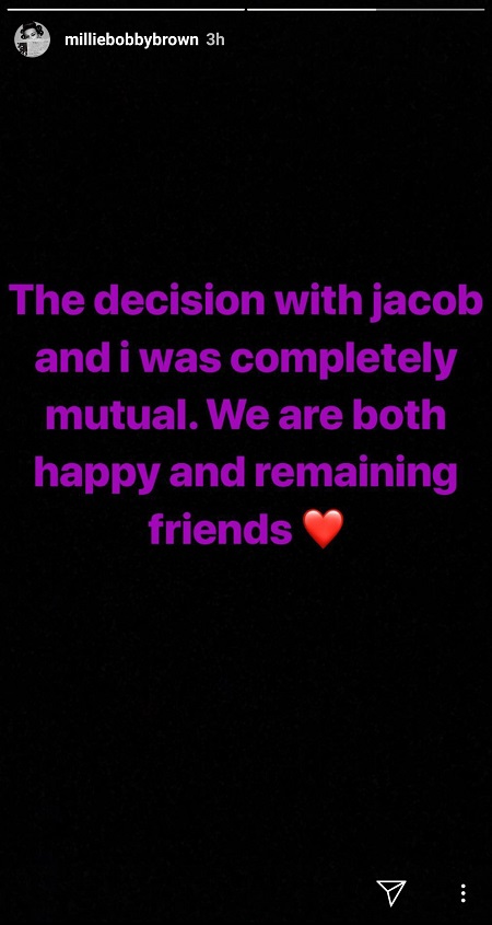 All of a sudden, the couple decided to part their ways in June 2018. Both the lovebirds called it an amicable dispatch and confirmed their split on their respective Instagram on 31 June 2018. Jacob wrote, 'The decision w mills were completely mutual, and we are both happy and remaining friends' while Millie shared 'The decision with Jacob and I was completely mutual. We are both happy and remaining friends' on Instagram.